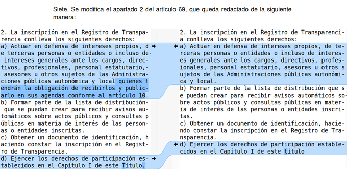 El cambio en artículo 69 supone eliminar “quienes tendrán la obligación de recibirlos y publicarlo en sus agendas conforme al artículo 10.” y de nuevo pérdida de transparencia.