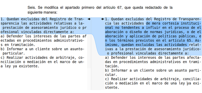 El cambio en artículo 10 y 67.1: la creación del concepto de “actividades de mera cortesía institucional no tendentes a influir en el proceso de elaboración o diseño de normas jurídicas” puede suponer de facto eliminar la utilidad del Registro de Transparencia, ya que no está definido de forma transparente quién decide si es o no “cortesía institucional”, y basta con que la administración y/o la entidad afirmen que es “cortesía institucional” para eliminar esa obligación. Considero que dado que sigue aplicando el artículo 71.2, se puede tener conocimiento, aun indiciario, a priori o posteriori, de que algún caso no es “cortesía institucional”, se debería poder reclamar la transparencia exige saber en qué fecha se celebró la reunión y quién asistió. Considero que para reducir cargas administrativas se podría mantener el registro solo con concepto “cortesía institucional”, y al tiempo para mantener la transparencia añadir retroactividad en la obligación de compartir documentación de actividades con lobbies que se hayan realizado siempre que desde el Consejo de Transparencia y Participación se considere que dicha reunión no fue de cortesía institucional.