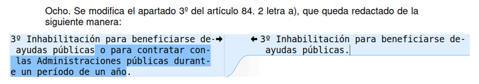 El cambio en artículo 84 supone suavizar la sanción eliminando “para contratar con las Administraciones públicas durante un período de un año.” No se entiende cómo eliminar una sanción objetiva, que es solo de un año, tiene relación con la modernización.
